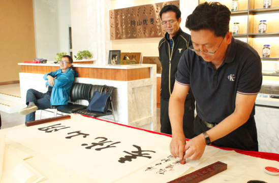 隨后,大家又來到燕麥博物館,感受燕麥文化、體驗燕麥產(chǎn)品的同時,并現(xiàn)場目睹書法名家張曉華老師的揮毫潑墨。孟才介紹,中國燕麥的市場份額在100億元以上,裸燕麥起源于中國,但是國內(nèi)燕麥深加工所用的原糧90%是進口皮燕麥,只有10%是國產(chǎn)裸燕麥,主要原因是國產(chǎn)裸燕麥多采用傳統(tǒng)旱作耕作方式,人工除草,有機種植,不使用除草劑、農(nóng)藥、化肥等,畝產(chǎn)較低。但是,也正因如此裸燕麥的口感更好、質量更佳且蛋白質、脂肪、β-葡聚糖等營養(yǎng)成分均高于皮燕麥。得天獨厚的資源優(yōu)勢是陰山優(yōu)麥建企立身的根基和市場競爭的底氣,產(chǎn)品全部采用優(yōu)質的國產(chǎn)裸燕麥就是陰山優(yōu)麥的核心競爭力!